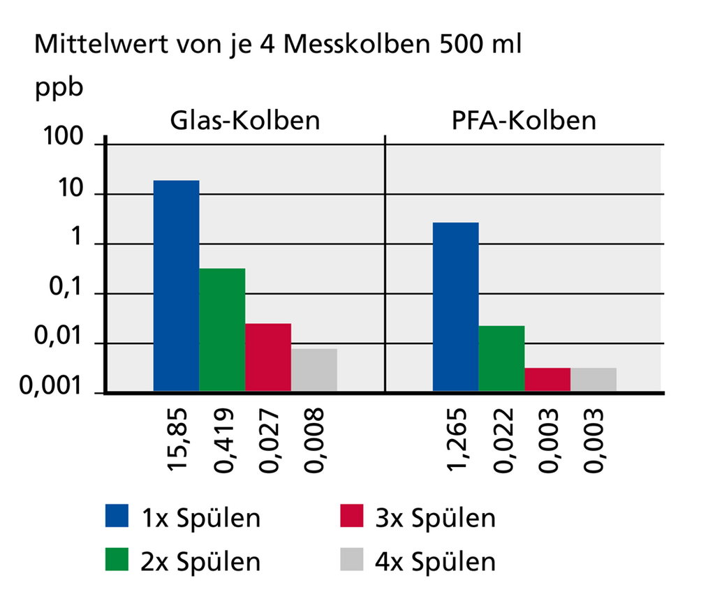 Die wertvollen Eigenschaften von PFA, vor allem der kaum vorhandene Memory-Effekt, unterstützen die Zuverlässigkeit von Analyseergebnissen in der Spurenanalytik. Im Vergleich zu einem handelsüblichen Glaskolben wird dies am Beispiel der einfachen Reinigung nach einer Kontamination durch eine Blei(Pb)- Lösung der Konzentration 1000 ppb (ng/g) deutlich (siehe Abbildung Reinigung von Messkolben). Die Reinigung der Glas- und PFA- Messkolben erfolgte durch Ausschütteln mit 65%iger HNO3 *Suprapur® (Pb < 0,005 ppm) bei Raumtemperatur. Bereits nach 3x Spülen erreicht man bei den PFA Messkolben die Grenzkonzentration von 0,003 ppb, während bei den Glaskolben auch nach 4x Spülen wesentlich höhere Konzentrationen Blei gemessen werden. Der Versuch zeigt weiterhin, dass für PFA Laborgeräte das übliche zeitaufwendige Auskochen entfallen kann.
