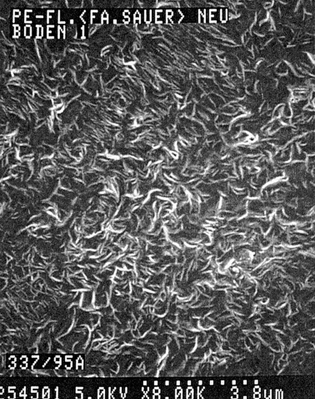 Gefäße aus PFA von VITLAB zeichnen sich auf Grund moderner Herstellverfahren und gegebenes Know-How durch extrem glatte, flüssigkeitsabweisende Oberflächen aus (siehe Abbildungen Oberflächenstruktur). Dies wird besonders im anschaulichen Vergleich deutlich. Die Aufnahmen mit dem Rasterelektronenmikroskop zeigen für PE-HD und PTFE unebene und unregelmäßige Oberflächen, auf der PTFE Oberfläche lassen sich tiefe Poren und Wölbungen erkennen. Im Kontrast zu den unebenen Oberflächen, musste die PFA Abdampfschale markiert werden (X) und zeigt eine völlig glatte, ebene und einheitliche Oberflächenstruktur.