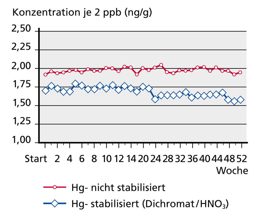 Anwendungsbeispiel Quecksilberstandards: Lagerung eines Hg-Standards in hochreinen PFA-Gefäßen (Konzentration je 2 ppb (ng/g). Quelle: GIT Labor-Fachzeitschrift 1/95