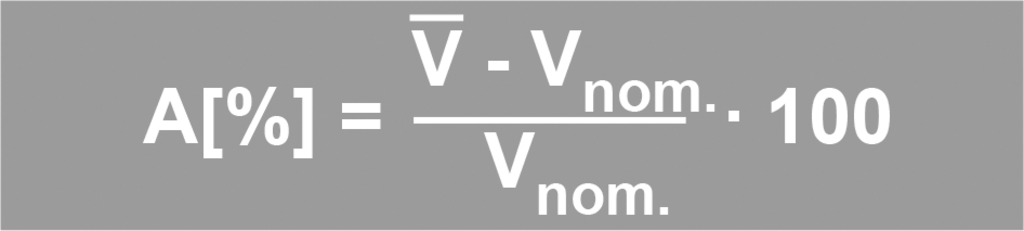 Die Richtigkeit (R) zeigt an, wie nahe der Mittelwert am Sollwert liegt, d.h. die systematische Messabweichung. Die Richtigkeit er- gibt sich als Differenz zwischen Mittelwert (⊽) und Sollwert (VSoll), bezogen auf den Sollwert in %.