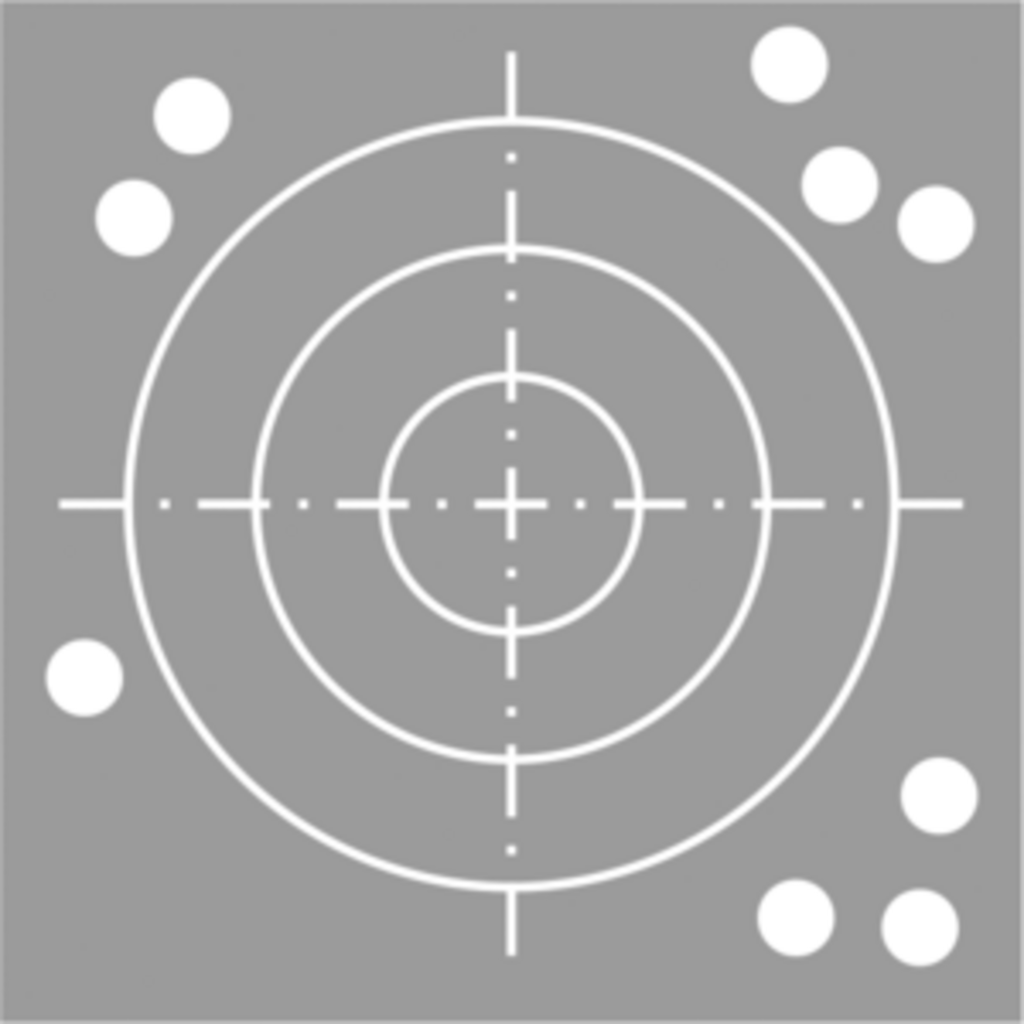 Die Zielscheibe stellt den Volumenbereich um den zentralen Sollwert dar, die weißen Punkte sind die Werte verschiedener Messungen eines definierten Volumens.