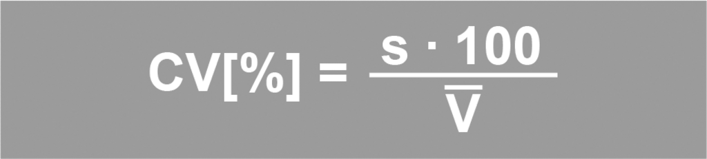 Der Variationskoeffizient (VK) zeigt an, wie nahe die einzelnen Messwerte beieinander liegen, d.h. zufällige Messabweichung. Der Variationskoeffizient ist definiert als Standardabweichung in %, bezogen auf den Mittelwert.