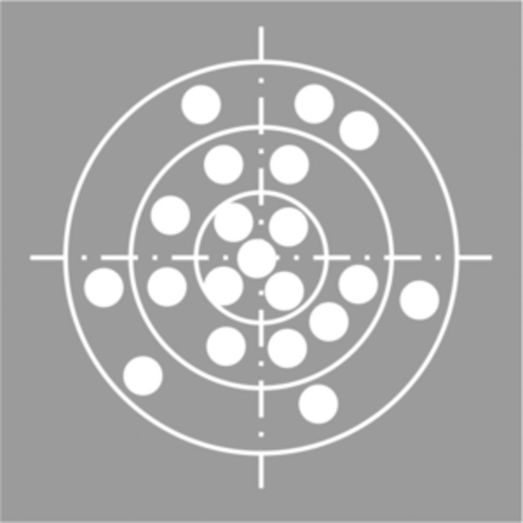 Richtigkeit gut: Im Mittel liegen die Treffer gleichmäßig um das Zentrum verteilt.