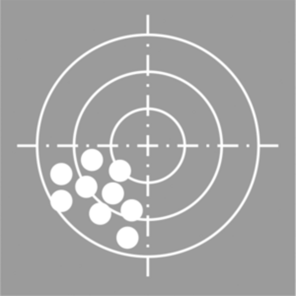 Richtigkeit schlecht: Obwohl alle Treffer dicht beieinander liegen, ist das Ziel (Sollwert) trotzdem verfehlt.