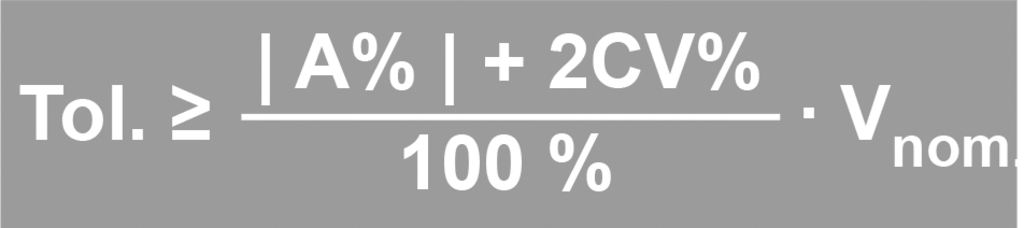 In guter Näherung lässt sich aus Richtigkeit und Variationskoeffizient die Toleranz z. B. für das Nennvolumen (VN) berechnen.