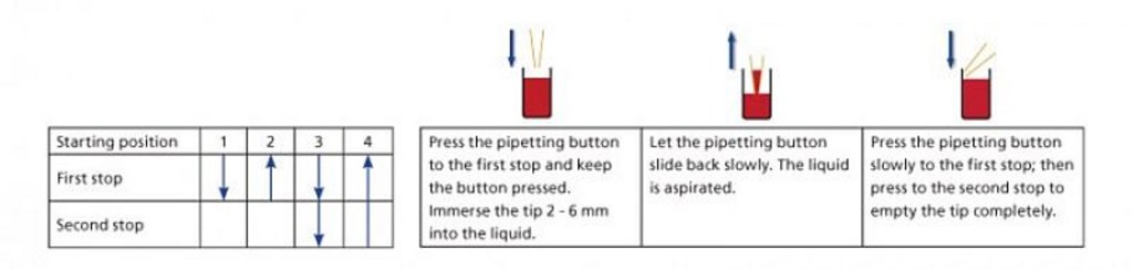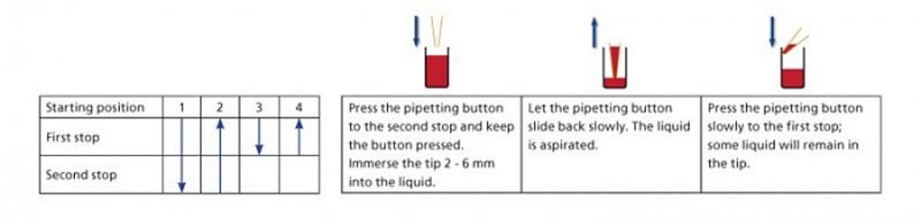 Pour le pipetage de solutions visqueuses, de solvants très mouillants ou de milieux à pression de vapeur élevée avec des pipettes à coussin d’air, on utilise la technique de pipetage inverse. Comparée au pipetage en mode direct décrit précédemment, cette technique s’applique de la manière suivante: